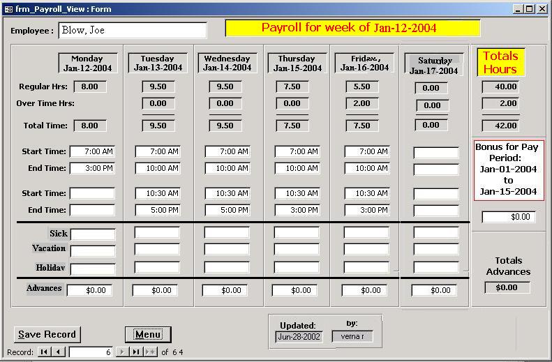 Above - Payroll Screen from the Payroll part of Grandma's Deli & Cateringa